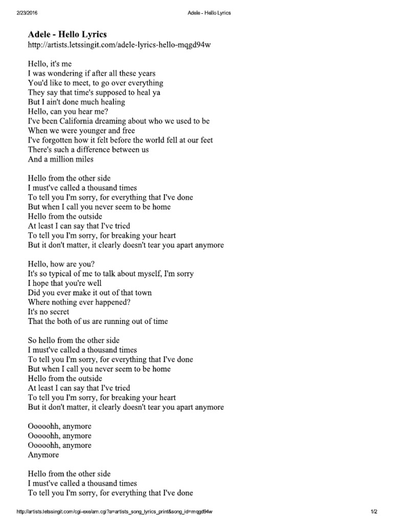 chorus hello from the other side i must've called a thousand times to tell you i'm sorry, for everything that i've done but when i call you never seem to be home. The way that i feel when i'm not in england, is. Emcgdi'm sorry, for everything that i've done, emcgdbut when i call you never seem to be home. There's such a difference between us and a million miles. Explore 49 meanings and explanations or write yours. Hello from the other side i must've called a thousand times to tell you i'm sorry for everything that i've done but when i call, you never seem to be home hello from the outside at least i can say that i've tried to tell you i'm sorry for breaking your heart but it don't matter, it. Hello is a song by british recording artist adele. Hello, it's me i was wondering if after all these years you'd like to meet to go over everything the.