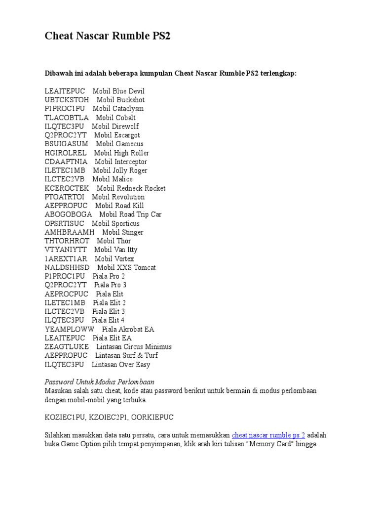 Nascar Rumble Ps2 - Lengkap Password Dan Cheat Nascar Rumble Racing Ps2 Safitri Info